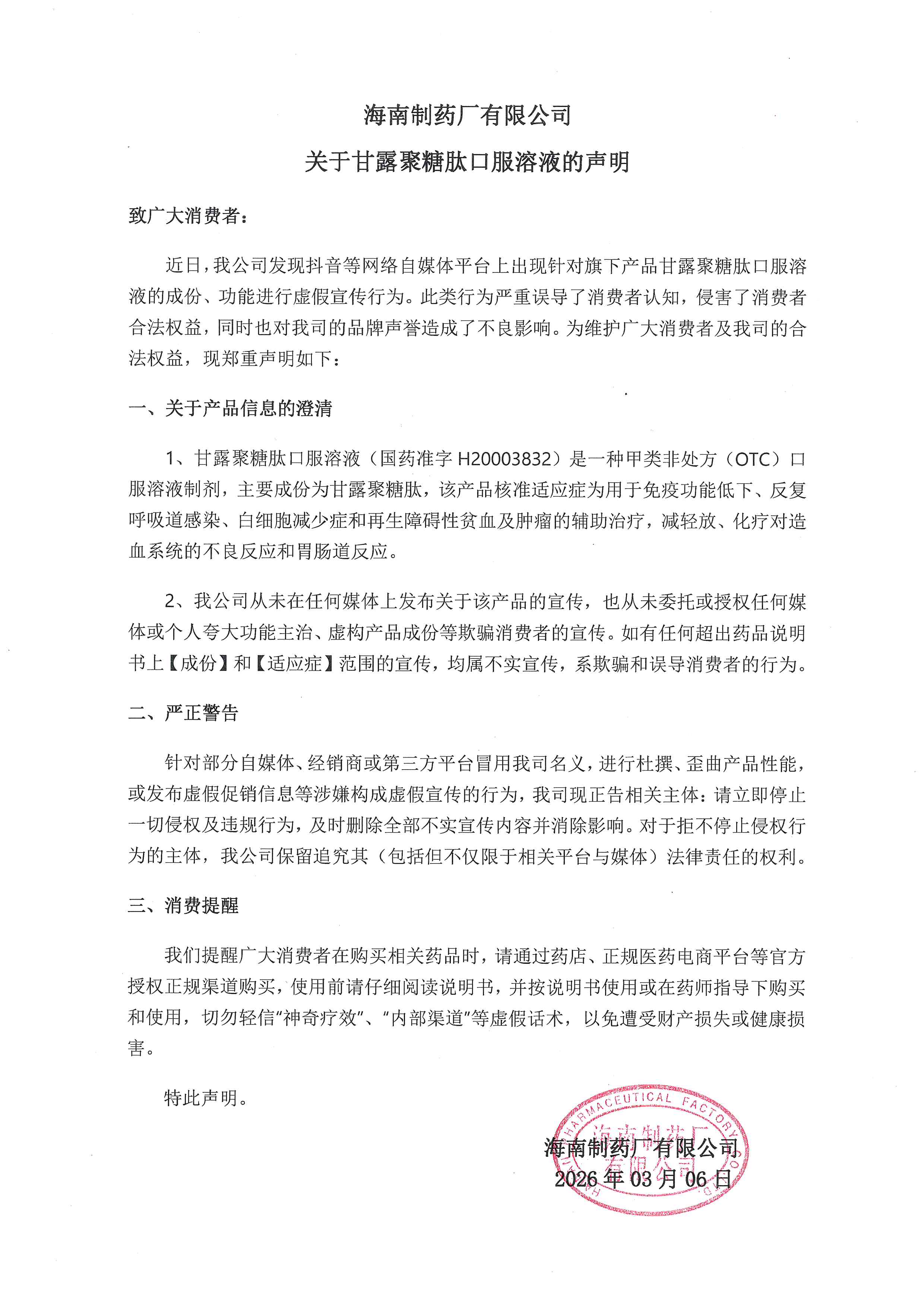 海南制药厂有限公司关于甘露聚糖肽口服溶液的声明